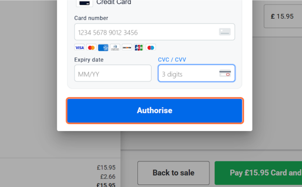 Step 9: Once the card details have been entered, get the customer to double check they are correct and then click on Authorise