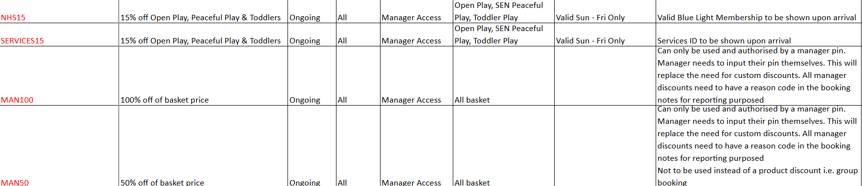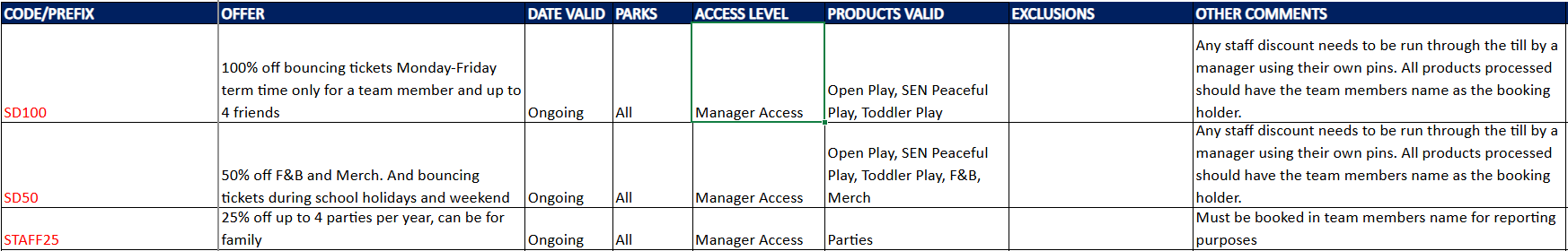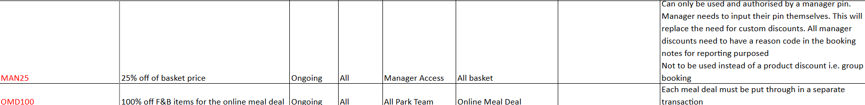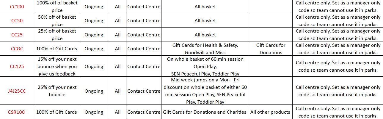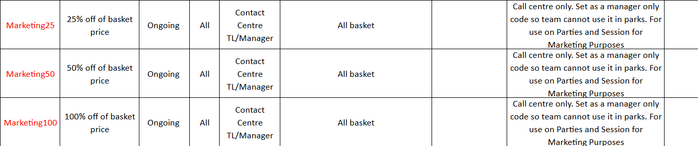 Please see a table below with details on in park discount codes. For up to date seasonal codes/promos please reach out to Marketing.